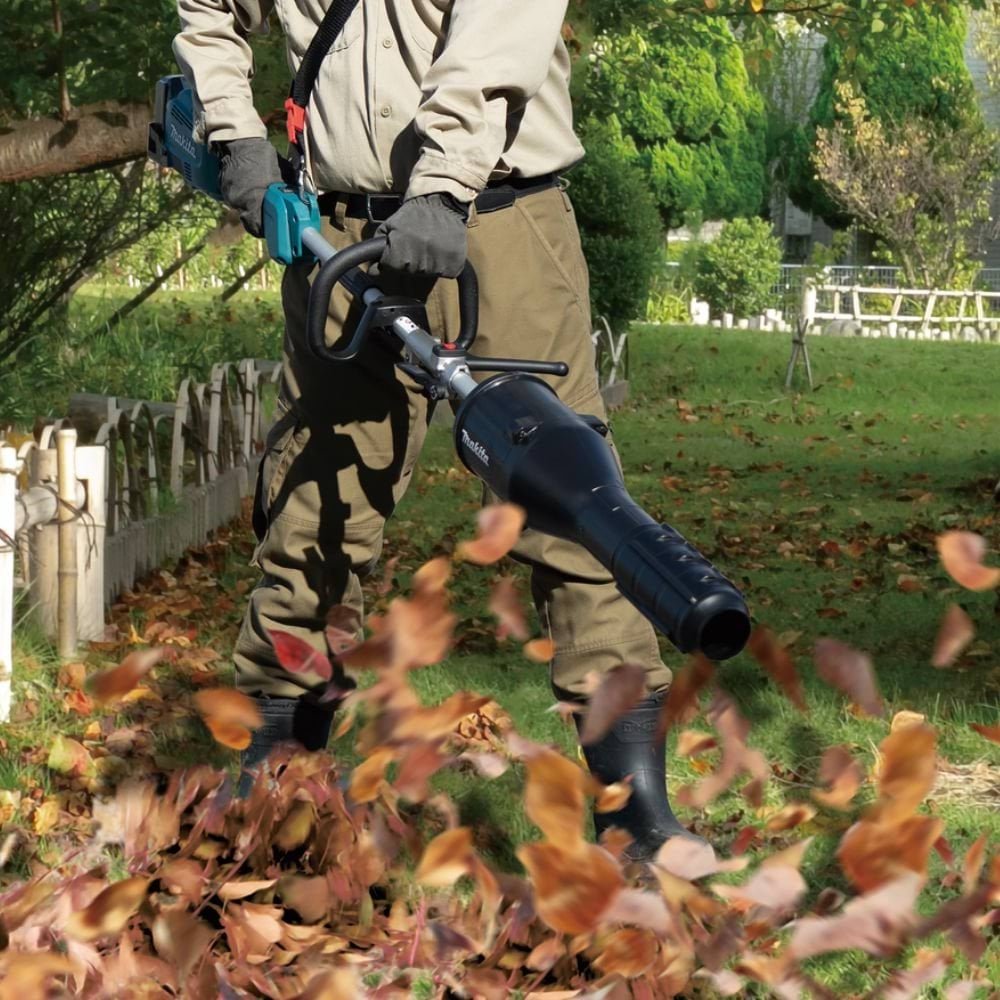 Este é o acessório soprador Makita UB402MP, compatível com cabeças de potência multifunções como DUX18, DUX60 e UX01G. É projetado para limpeza eficiente, oferecendo diferentes velocidades de ar e volumes de fluxo, ideal para remover folhas e detritos em áreas externas.