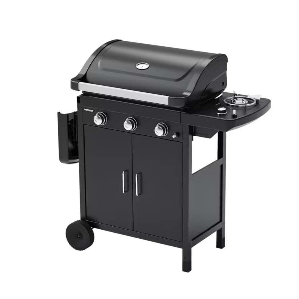 A Churrasqueira a Gás Compact 3 EXS Campingaz 2181063, fabricado na Itália com design europeu Campingaz, é uma Churrasqueira a Gás portátil que combina estilo e potência (7,5 kW + 2,1 kW no queimador lateral). Com 3 queimadores de aço inoxidável e uma grelha/placa reversível de ferro fundido esmaltado (2.135 cm²), oferece versatilidade para 8 a 10 pessoas. Equipado com acendimento piezoelétrico, termômetro na tampa de ferro fundido, sistema InstaClean Aqua, mesa lateral rebatível e carrinho com portas, é ideal para churrascos memoráveis em jardins ou campings.