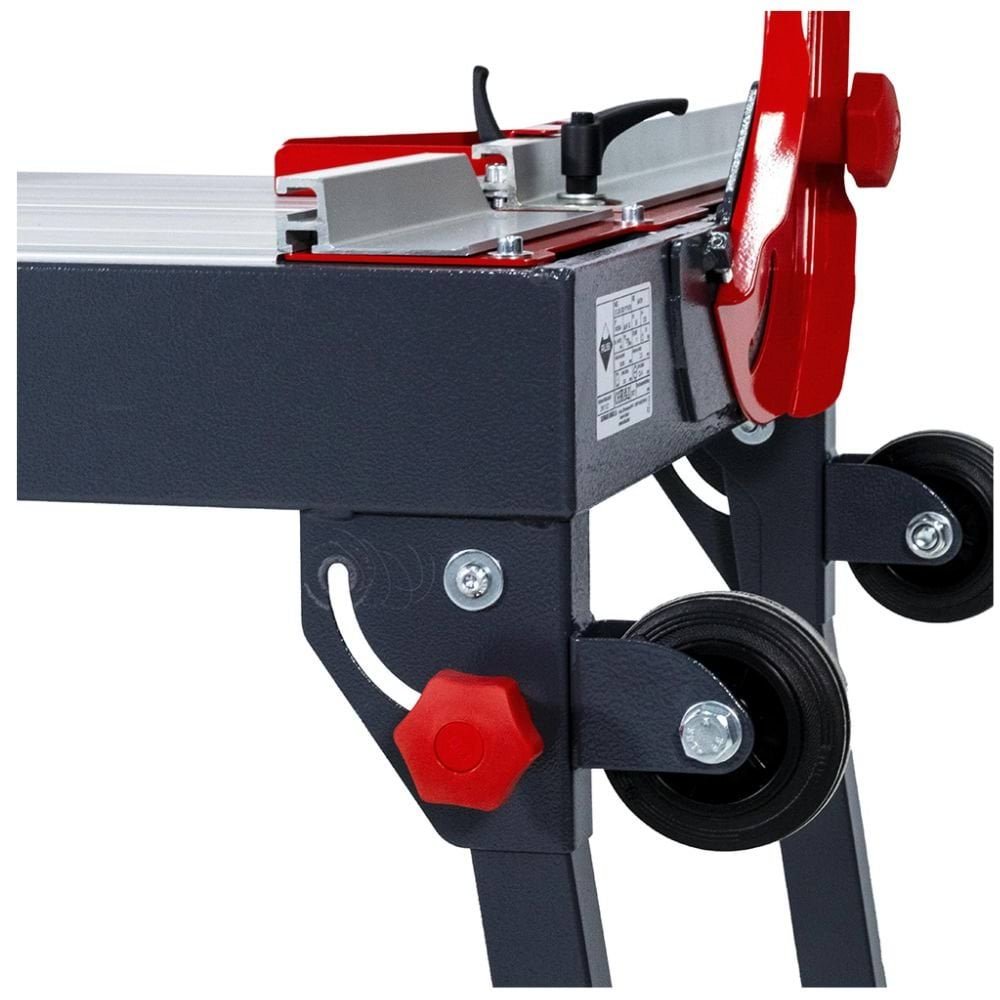 Características adicionais: Sistema ZERO DUST, refrigeração C3 PYTHON, mesas de alumínio desmontáveis, pernas dobráveis com rodas, cabeçal móvel sobre rolamentos, régua graduável (0 a 60º), esquadro com tope lateral