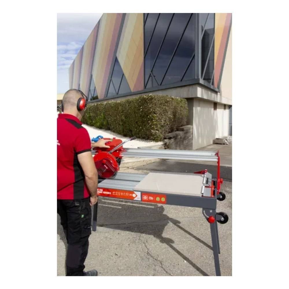 O Cortador DC-250 SMART ADVANCE 1200 230V 50 Hz Rubi 53913 é uma cortadora elétrica de cabeçal móvel de alta precisão, projetada para profissionais que trabalham com azulejos cerâmicos, grés esmaltado, grés porcelânico e pedra natural. Equipado com um motor monofásico de 1,5 CV (1,1 kW) com protetor térmico, oferece cortes retos até 120,5 cm e cortes a inglete até 106 cm. O sistema de refrigeração C3 PYTHON ajusta o fluxo de água para otimizar o corte, enquanto o sistema ZERO DUST, certificado pela TNO, reduz partículas de poeira, garantindo um ambiente de trabalho mais seguro. As mesas de alumínio desmontáveis facilitam a limpeza, e as pernas dobráveis com rodas tornam o transporte mais prático. Inclui disco de diamante CEV-SUPERPRO Ø250 mm, régua graduável (0 a 60º) e esquadro com tope lateral para cortes repetitivos e angulares.