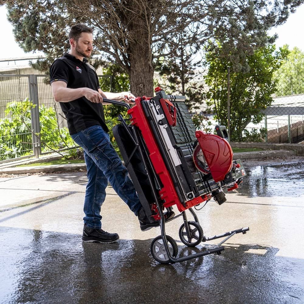 O Cortador DT-250 MAX 240V 50Hz Rubi 58915 é uma cortadora elétrica de alta precisão, projetada para profissionais que trabalham com azulejos cerâmicos, grés porcelânico e pedra natural. Equipado com um motor monofásico de 1,5 CV (1,1 kW) e 4000 RPM, permite cortes retos até 90 cm e cortes a inglete até 60 cm. O sistema de refrigeração ajustável com bomba de água otimiza o desempenho do disco de diamante CEV-SUPERPRO Ø250 mm (incluído), garantindo cortes limpos e sem sobreaquecimento. A estrutura robusta em alumínio e aço, com mesa basculante e esquadro ajustável (0 a 45º), facilita cortes angulares e repetitivos. Possui pernas dobráveis para fácil transporte e armazenamento, sendo ideal para instalação de pavimentos e revestimentos em projetos de construção e renovação.