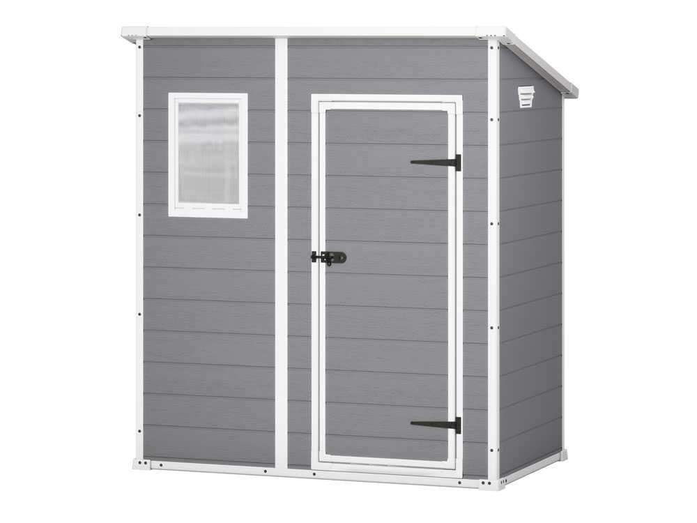 Keter Manor Pent Cinzento 183,5x111x200,5 cm. Abrigo de jardim compacto com janela frontal, robusto e elegante. Ideal para pequenos espaços exteriores.