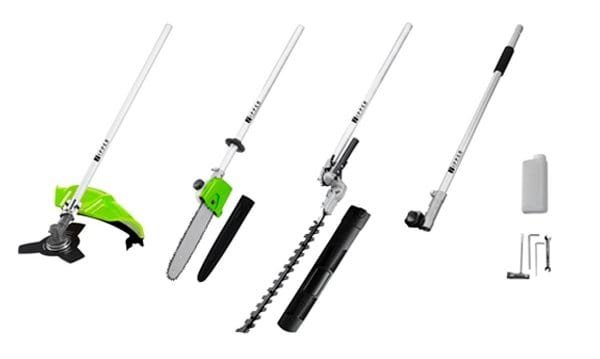 A máquina possui um motor de 1 cilindro a 2 tempos, 3 cabeças de fixação diferentes que permitem cortar sebes, canteiros e árvores.